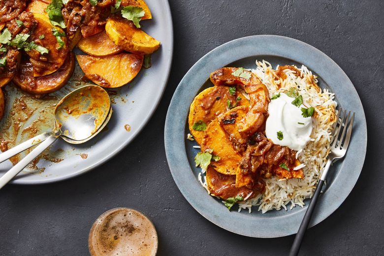 Make a meal out of this smothered squash by having it with rice and salted yogurt, or serve it as a side for roast chicken or a seared pork chop. The mild winter squash gets a punch from a spicy and tart onion gravy that comes together while the squash roasts in the oven. Be sure to season the gravy aggressively with salt so the vinegar, chile and spices pop.