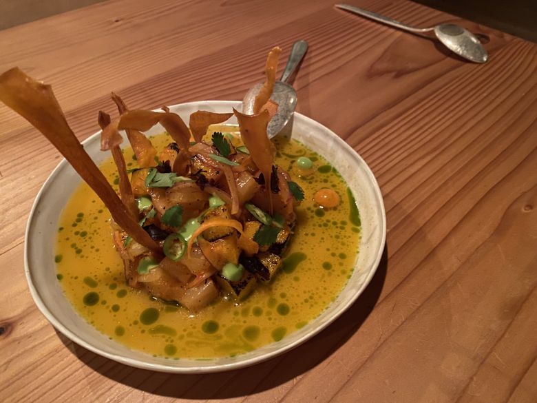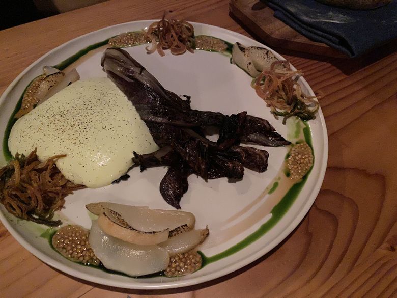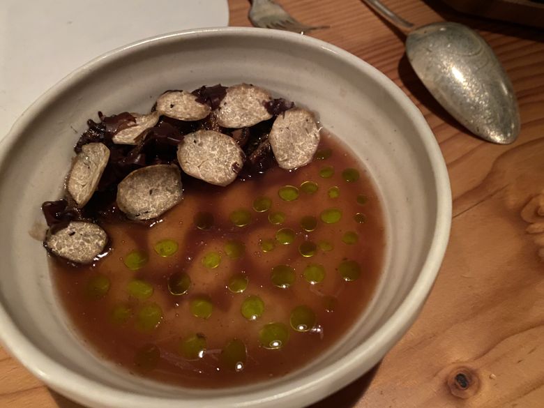 The staff was still wonderful; seated there by chance again, the one booth still needed more secure mooring. A Douglas fir truffle custard, served warm — Seabird’s take on chawanmushi — seemed to glow in its small bowl. Made with chanterelles and truffles foraged in the forests of the Olympics, plus local matsutake and lobster mushrooms too, and madrone tea, braised kombu and dots of housemade pine oil, it contained silkiness, meatiness, umami and essence of the woods — it tasted magical, maybe made by elves or trees themselves, perfect for a dark and cold Northwest night.