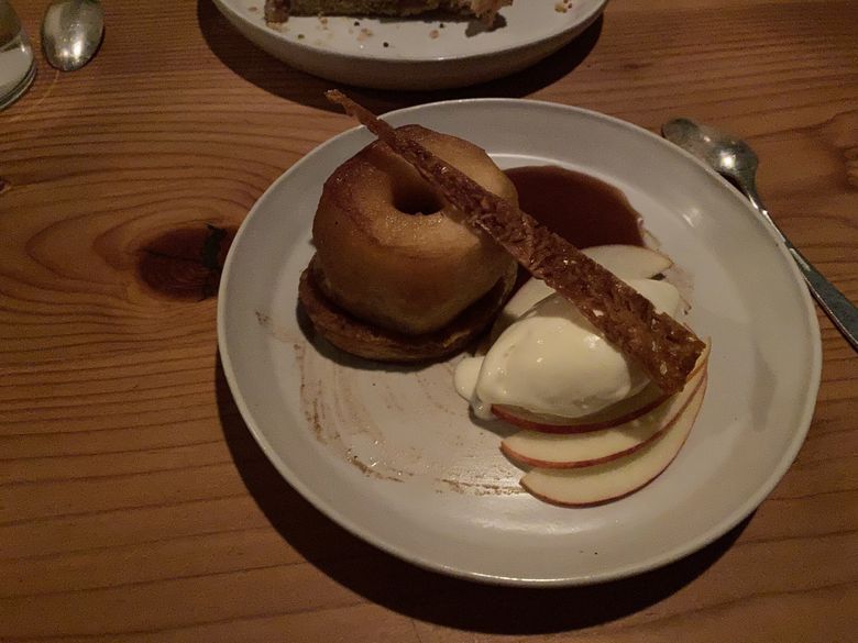 THE TWO DESSERTS available looked splendid and tasted like best-possible endings to a late autumn night — velvety local honey sorbet atop a crunchy-edged spoon cake made with more fabulous Packham pear; a whole baked Cosmic Crisp apple resting on a cushion of puff pastry with understatedly sweet caramel and tart crème fraîche ice cream. With exquisitely ripe fall fruit as the basis, the balance and nuance in tastes and textures felt just right, as well as too little, too late. According to a PR representative for the restaurant, chef Rico is in charge of the dessert program, too — is this his true wheelhouse? In the end, it serves as a puzzling final punctuation mark for a third baffling, disappointing evening at Seabird.