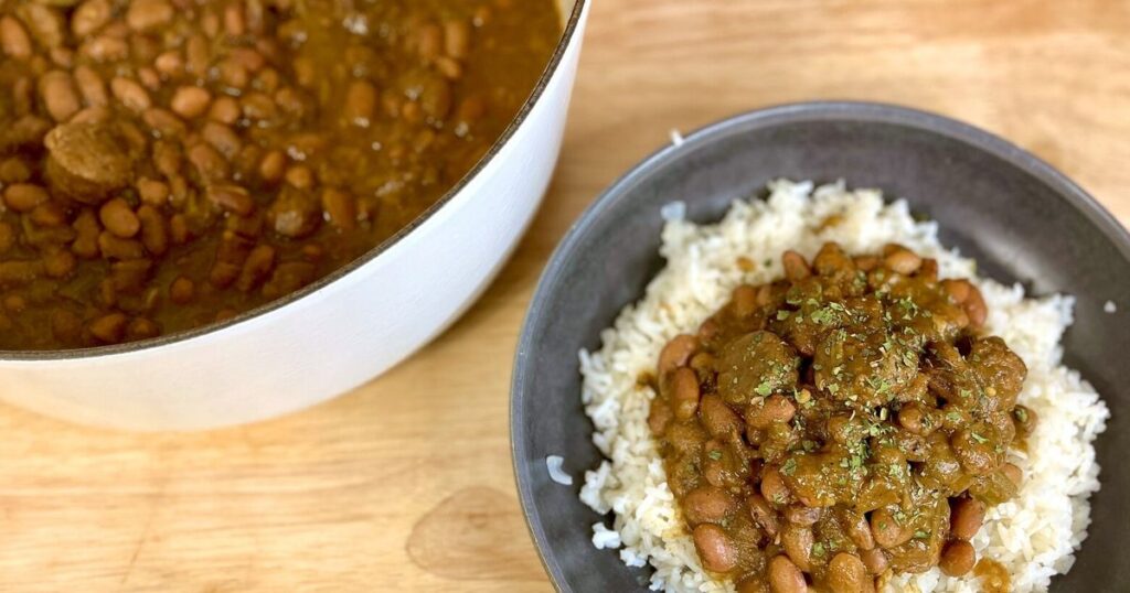 Red beans and rice is a Southern classic, and every family has its own version. My mom’s pinto beans are spiced with chili powder and slow-cooked with onions creating a thick savory broth. I like my pinto beans with a little more Creole flair, andouille sausage and the holy trinity: onions, celery and peppers.